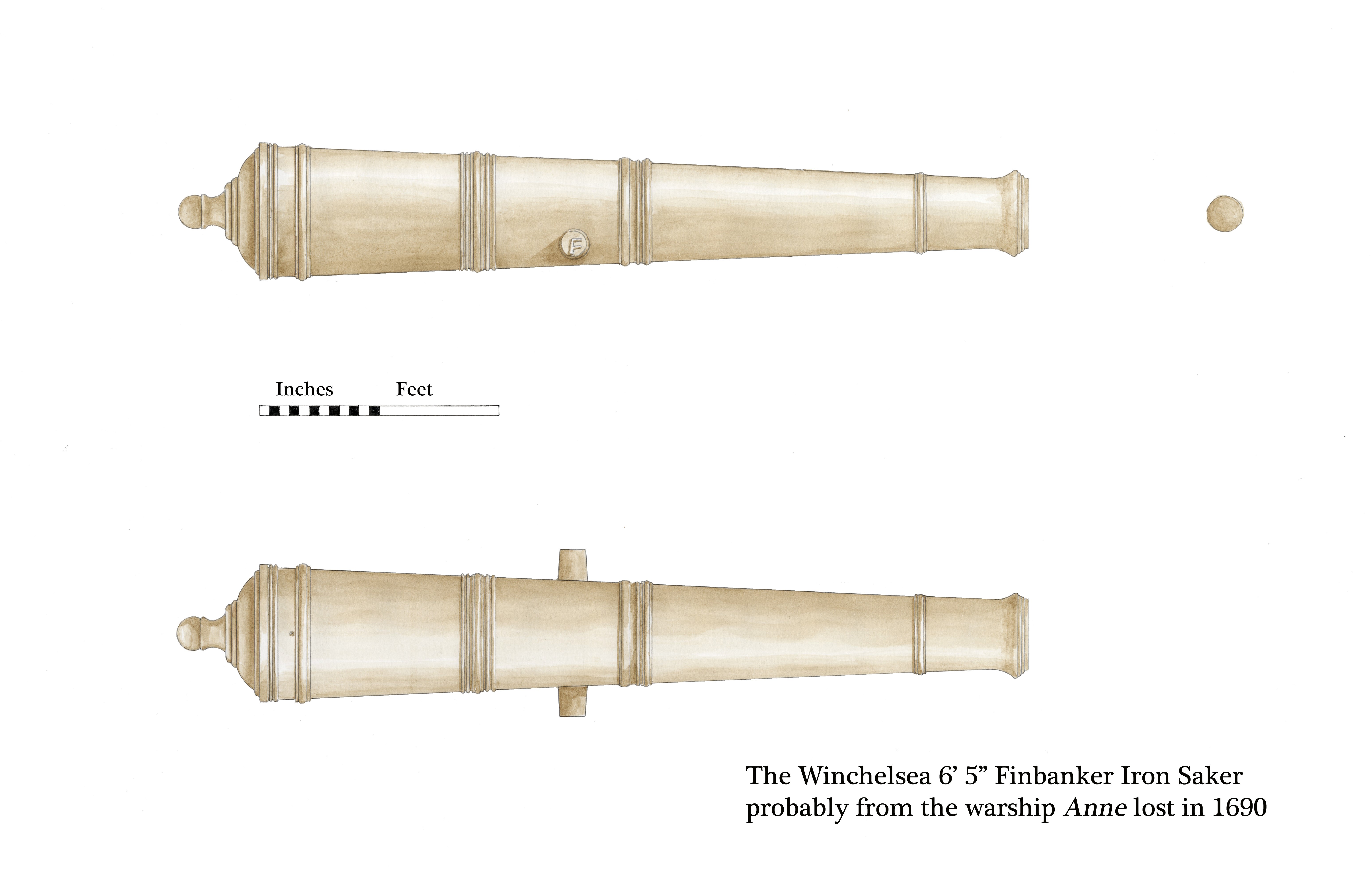 Recently a gun was seen at the Winchelsea Museum by Jacqui Stanford, local resident and Chair of the Shipwreck Museum, Hastings and English Heritage-appointed Licensee of the Anne. The Shipwreck Museum has a particular interest as it is the owner of the Anne, and as the gun was clearly very old and reportedly found locally she raised the interest of historians interested in the ship. In March 2010 it was examined by the respected independent gun expert, Charles Trollope. He identified the gun as an iron Saker of 77 inches long with the remains of an “F” cast on the end of the right trunnion identifying it as being cast at the Finspong foundry in Sweden in the middle of the seventeenth century. No other markings are now visible. He added that the guns were given the generic name “Finbankers” and were of high quality. When captured from the Dutch they were reamed out to English bore sizes, in this case 3 ½” then proof tested and issued to English ships. The button is missing at the rear and the outside surface shows evidence that it had been buried upright at a depth of about five feet. Some groves are visible in the bore suggesting an iron spike had been inserted to act as a fulcrum for a pivot gun as part of a traversing platform in a battery suggesting it may have been part of the canal defence system introduced in the 1790’s. Charles points out that a possible site for the gun would have been the battery constructed in the 1790’s at Winchelsea Beach where Rye New Harbour used to reach the sea. It would have been redundant with the completion of the Royal Military Canal and Martello Towers and removed by the landowners in about 1840. When the battery was constructed it was the local engineer’s responsibility to find a solid pivot for the guns and the likelihood is that he used an old gun that had failed proof at Winchelsea 100 years before. Although the gun is not exactly the length given in the Anne’s 1690 gun list, it is certainly near enough to qualify as one of her twelve seven foot long Sakers. Ten of these were mounted on the quarterdeck and the remaining two on the forecastle. The button may have been lost in 1690 and was the reason for its rejection or removed at the time the battery was constructed. Although it is not possible to say the gun was definitely from the Anne, it is highly likely.