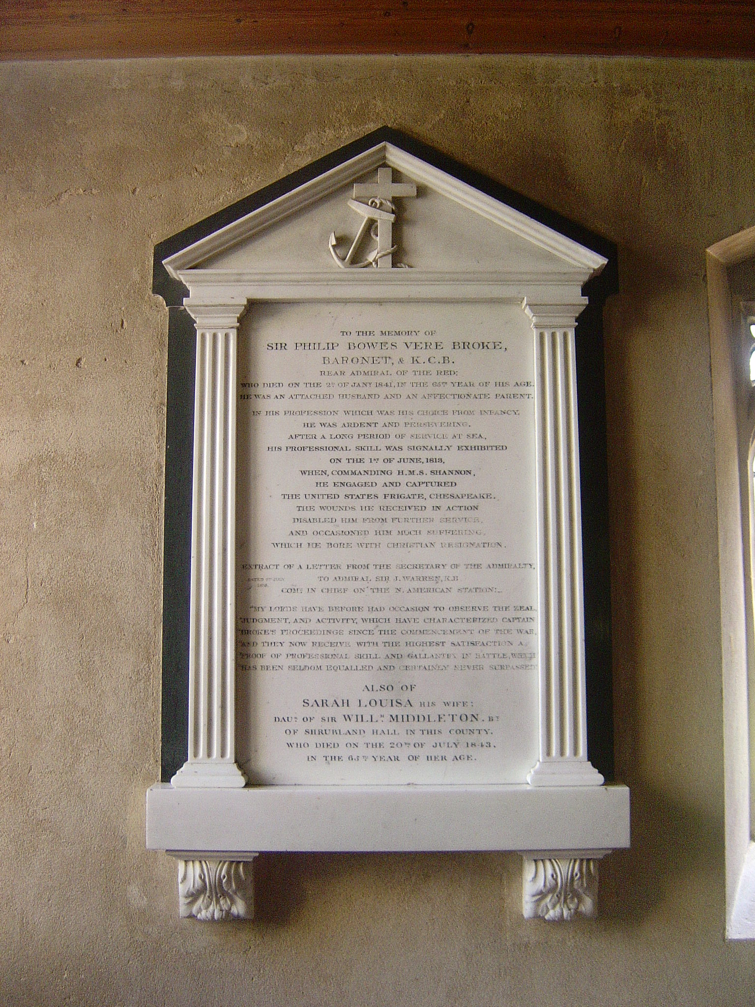 I thought I’d complement the images of Lawrence’s tomb with the memorial at Nacton church, Suffolk, to the victor of the action, the gunnery fanatic Philip Broke. It couldn’t be a more different location, or a more different memorial – a relatively small, understated wall tablet in a quiet, obscure country church, far from London and well off the beaten track. But it was adjacent to Broke’s ancestral home, and another memorial in the same church records his ancestor Packington Brooke, one of those whom I’ve always called ‘my officers’, who was killed in battle in 1665.